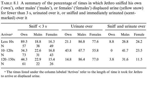 Bekoff would wait until Jethro (a neutered male German Shepherd and Rottweiler mix) or other known female and male dogs urinated on snow, and then scoop up the clump of yellow snow as soon as Jethro was elsewhere and did not see him pick it up or move it (Bekoff used clean gloves each time and took other precautions to minimize odor and visual cues). Bekoff then moved the yellow snow varying distances down the path so that Jethro would run across the displaced urine: (i) within about 10 seconds, (ii) between 10-120 seconds later, or (iii) between 120-300 seconds later. After Jethro arrived, Bekoff recorded how long he sniffed at the yellow snow, whether he urinated over it using the typical male raised-leg posture, and whether urination immediately followed the sniffing (“scent marking”).